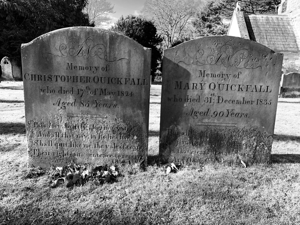… and then in the curious way in which these things play upon our minds, this gave me the notion of trying to visit and photograph the graves of as many of my direct ancestors as pssible. A lovely example is the grave of my 5 x great grandparents Christopher QUICKFALL (1739-1824) and his wife Mary QUICKFALL (nee BUTTON) (1744-1835). Their two graves nestle close beside St Peters in the Lincolnshire village of Great Limber and I visited them on a cold March morning in 2022.